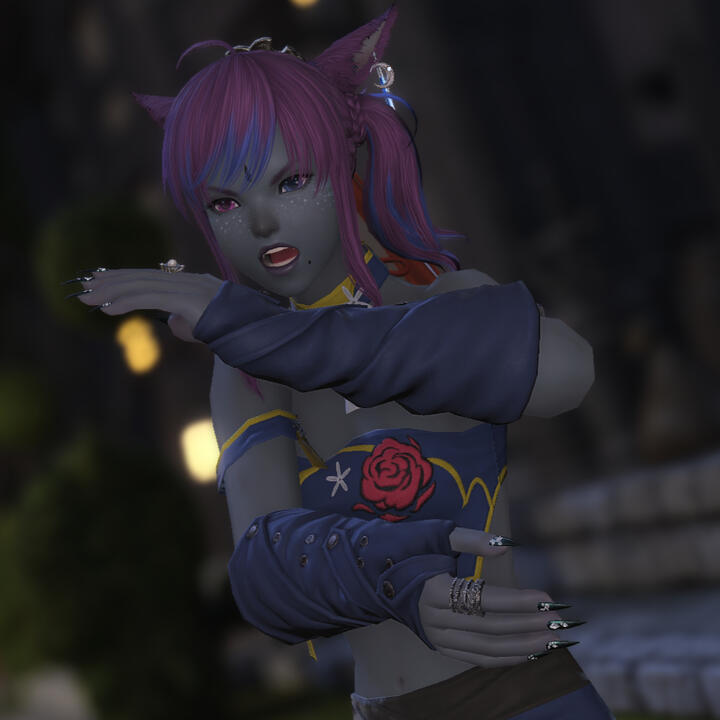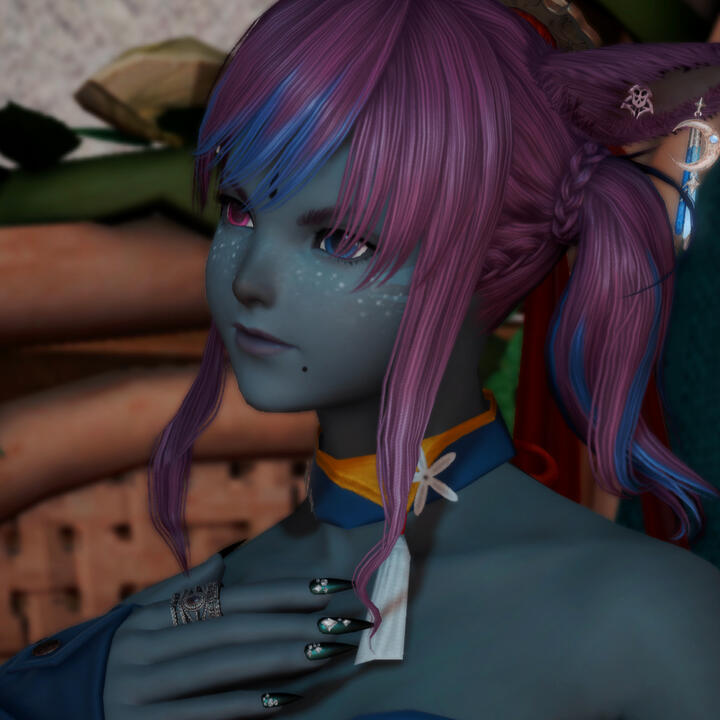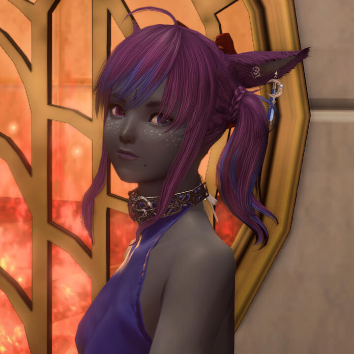 AppearancePahja is a young Keeper of the Moon Miqo'te with medium gray skin and bicolored pink and blue eyes. She has shoulder-length reddish-violet hair with bright blue highlights.She is as short as an adult miqo'te woman can be and a bit on the thin side - the result of being born a 'runt'.Due to difficulties with making friends, her claws are often extended. Between that and certain other 'animal-like' features, she often seems to emulate certain bestial traits.She has a strangely high pitched voice, and rolls her R's when she speaks.